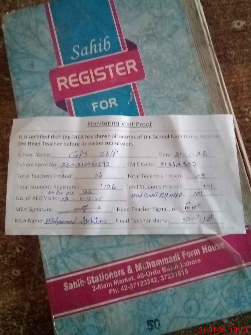| Attendance Register | Head Teacher | MEA with School | Visit Proof |