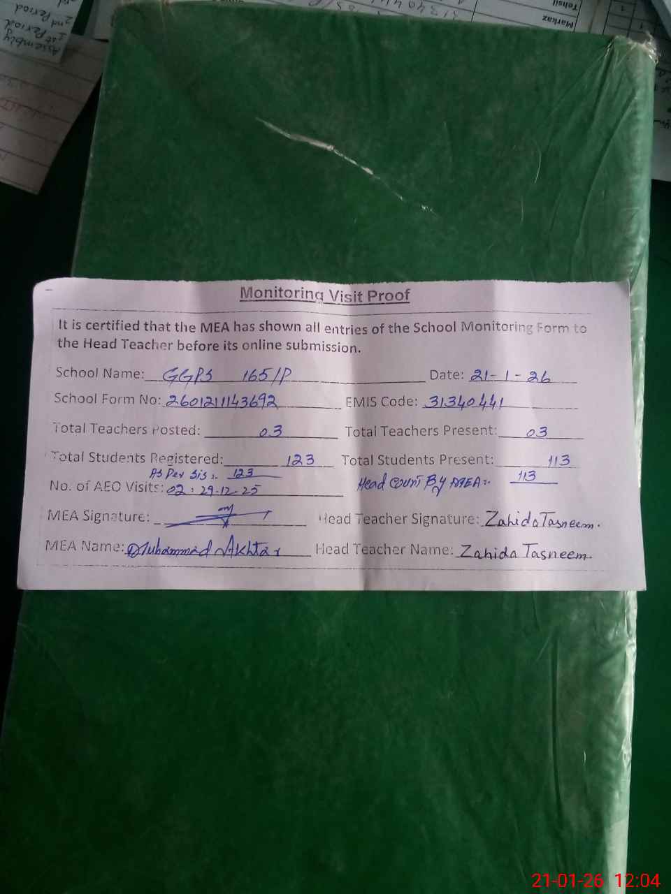 | Attendance Register | Head Teacher | MEA with School | Visit Proof |