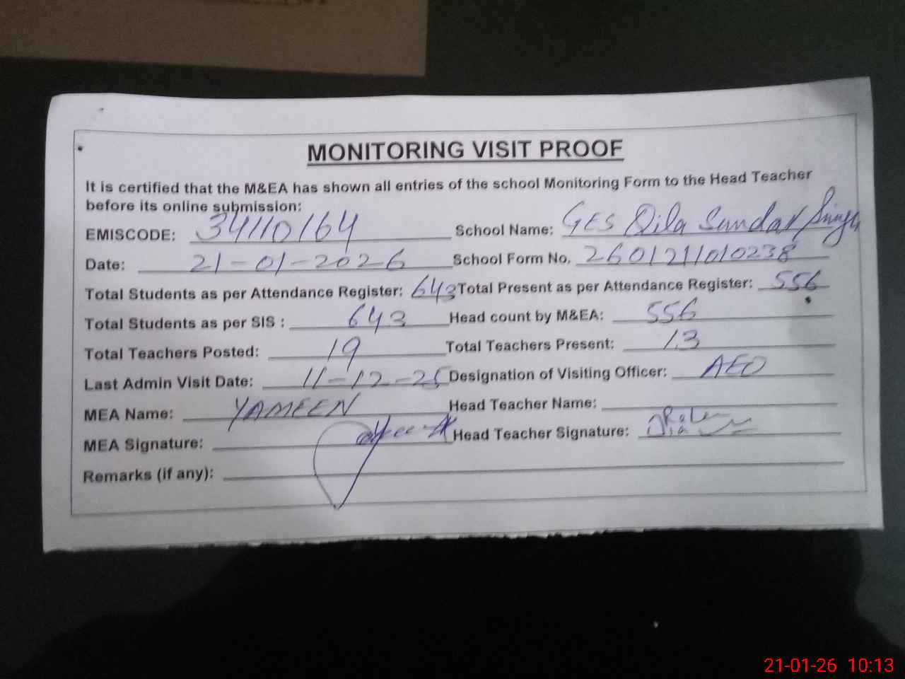 | Attendance Register | Head Teacher | MEA with School | Visit Proof |