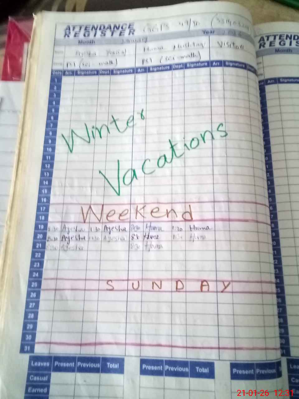 | Leave | Duty | Absent | Maternity | Medical | Ex- Pak |