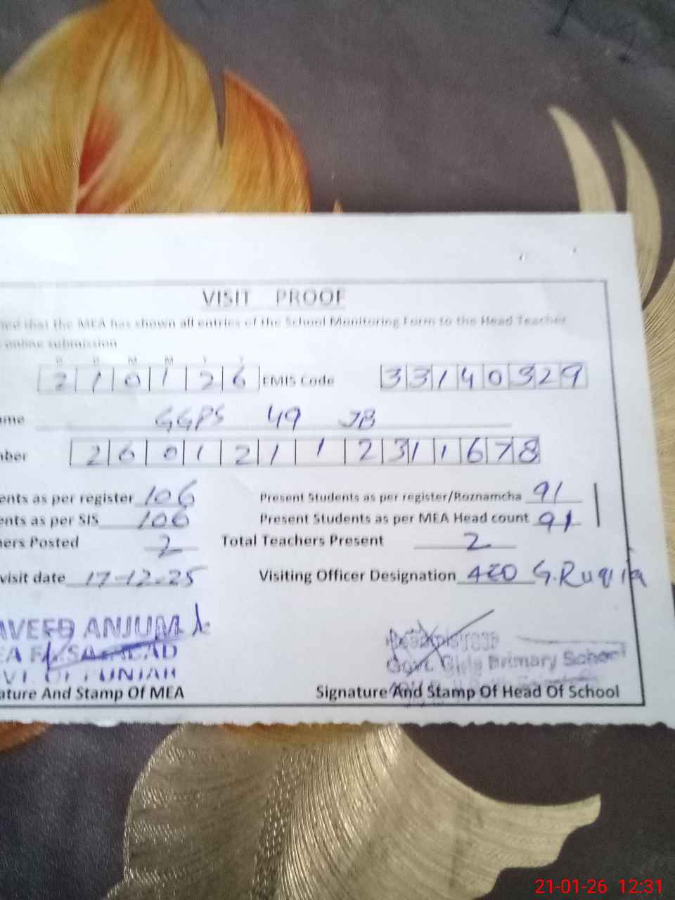 | Attendance Register | Head Teacher | MEA with School | Visit Proof |