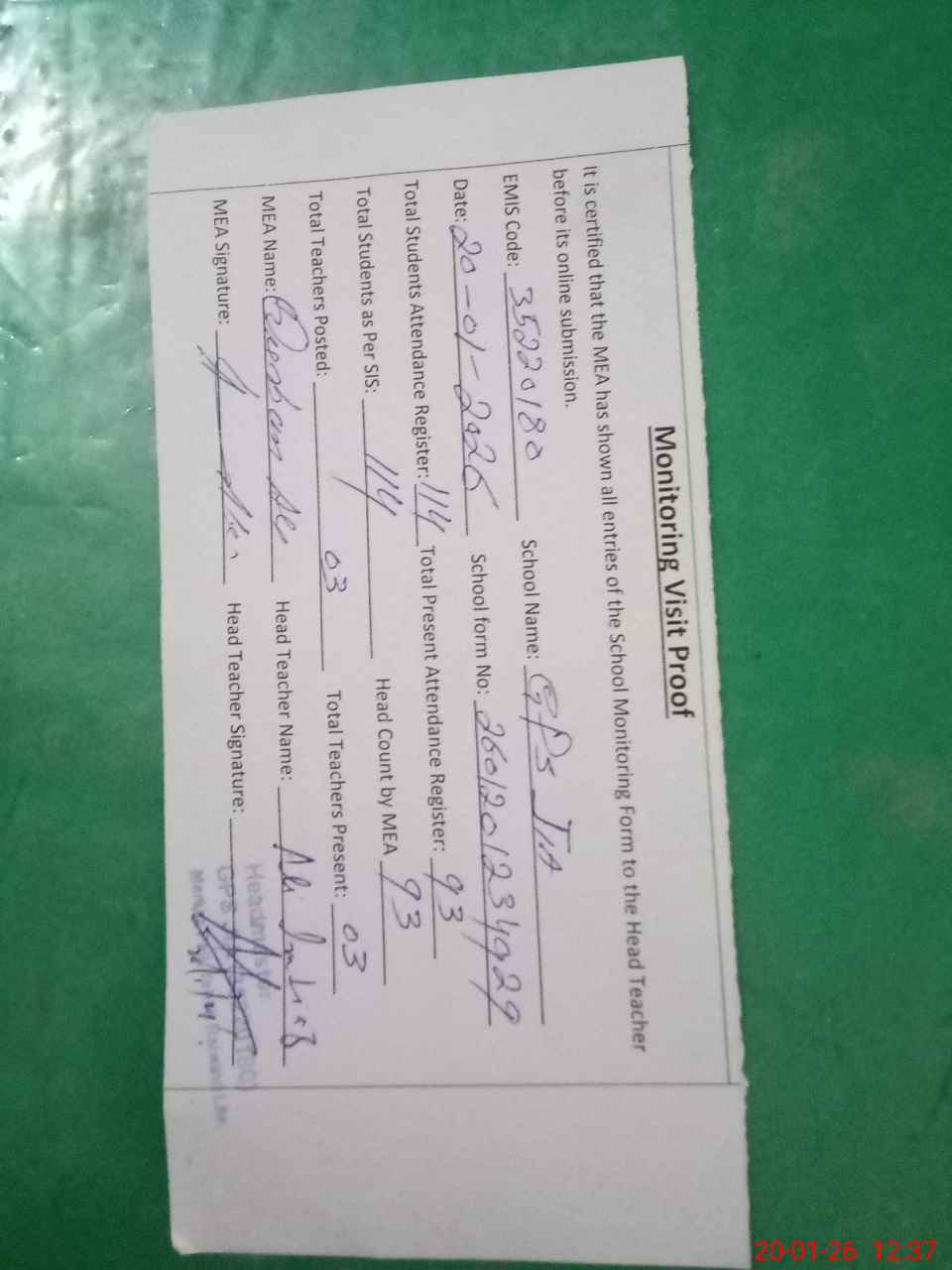 | Attendance Register | Head Teacher | MEA with School | Visit Proof |