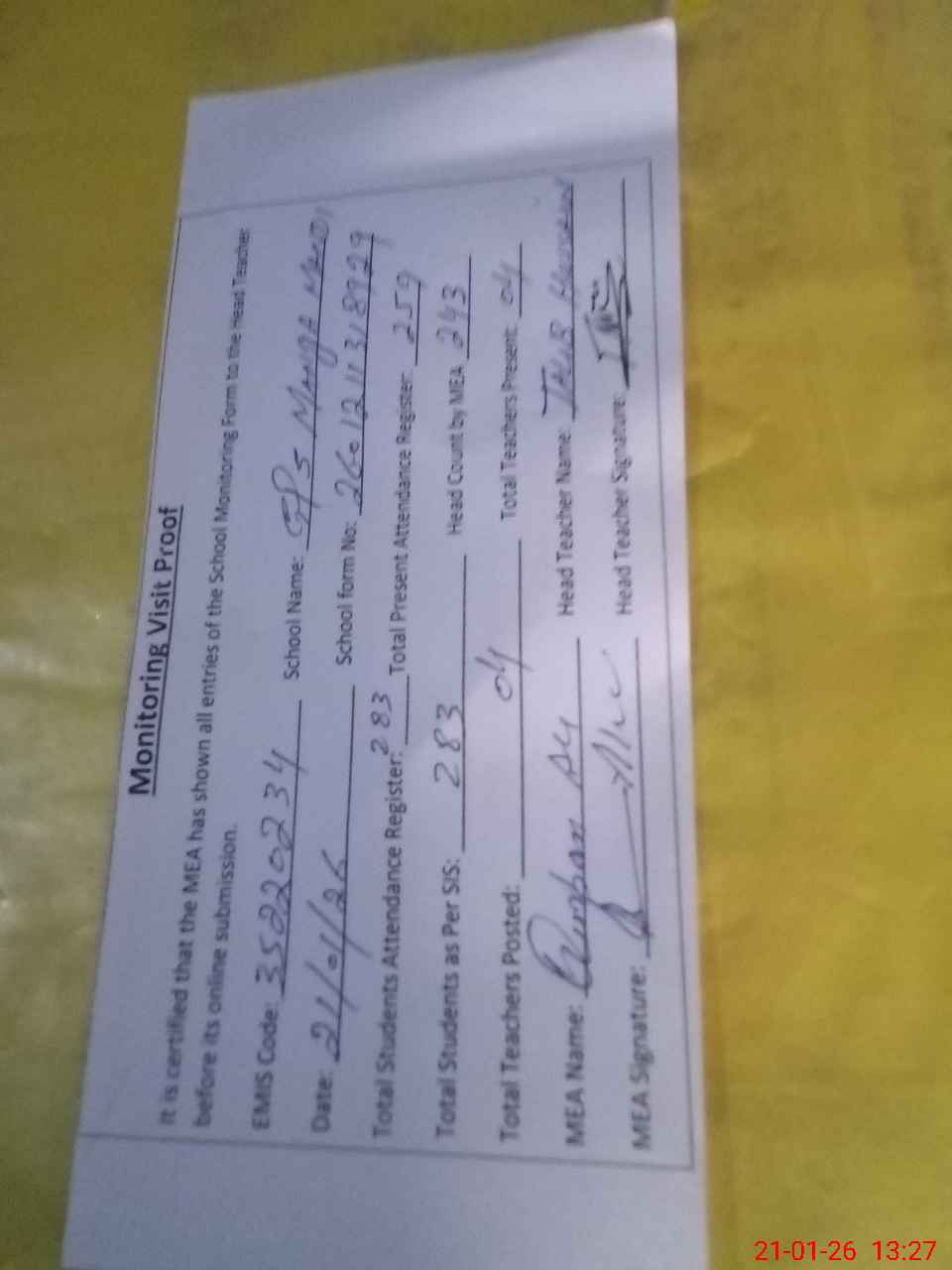 | Attendance Register | Head Teacher | MEA with School | Visit Proof |