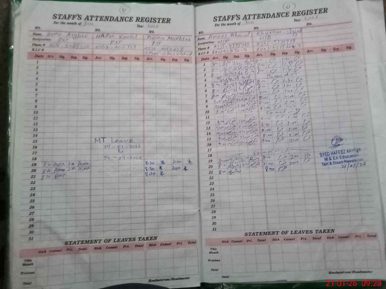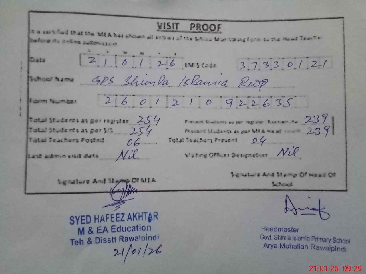 | Name: As**** Sh**** Designation: (School Headmaster's/Headmistress's) PST Phone/Cell Number: 03**** |