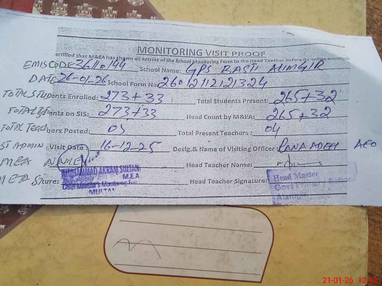 | EMIS Code: 36110144 | Name of School: GPS ALAM GIR MOUZA ALAMGIR TEH. DISTT. MULTAN | |||