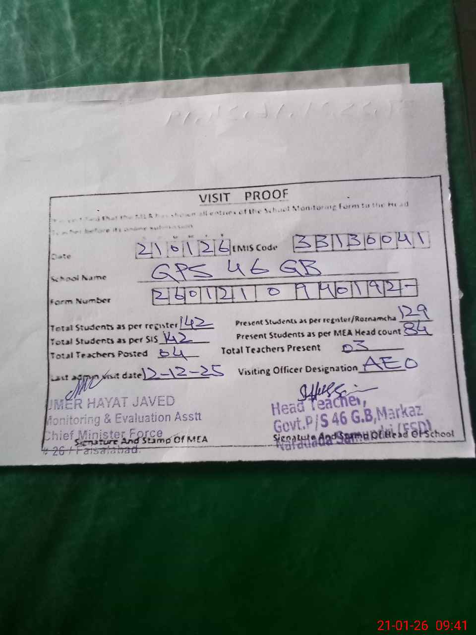 | Attendance Register | Head Teacher | MEA with School | Visit Proof |
