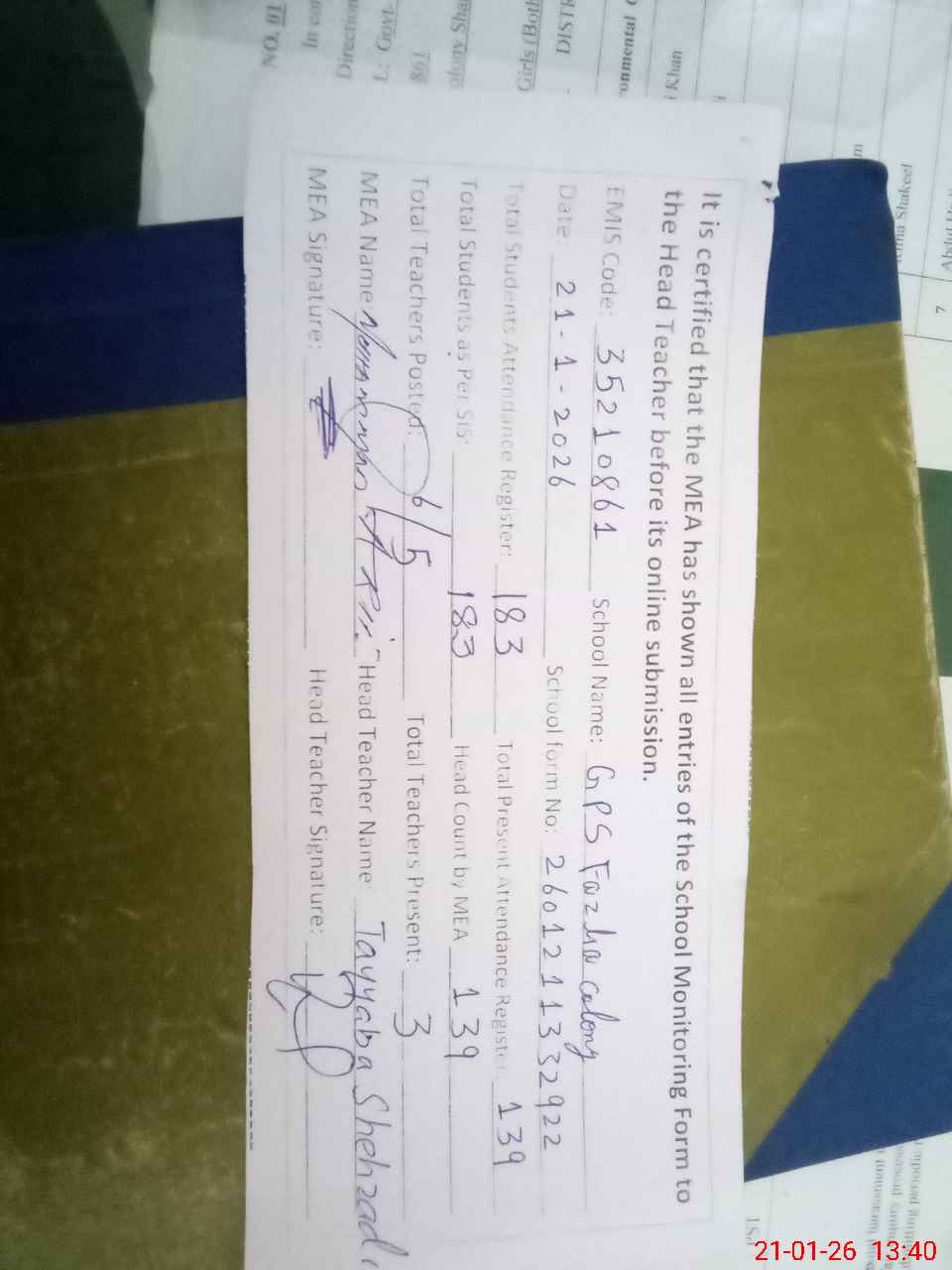 | EMIS Code: 35210861 | Name of School: GPS FAZALIA COLONY (EX-MCL) | |||