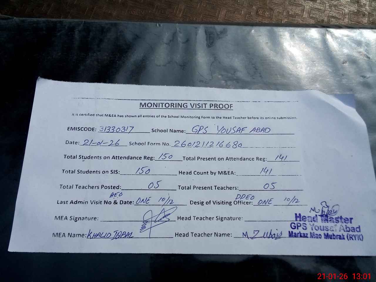 | Attendance Register | Head Teacher | MEA with School | Visit Proof |