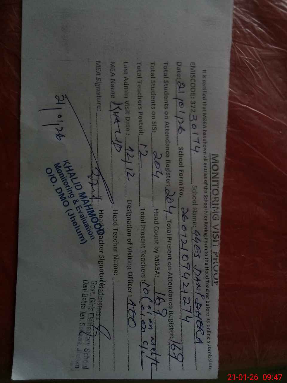 | Certified that this School was Inspected by the Undersigned MEA/DMO Today and the Information Stated Above is as Per Record. | |||||