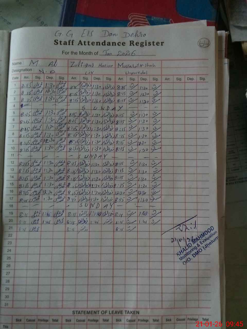 | CNIC | Full Name | Designation | R/C | Absence During Last Calender Month |