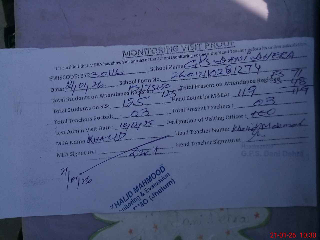 | Attendance Register | Head Teacher | MEA with School | Visit Proof |