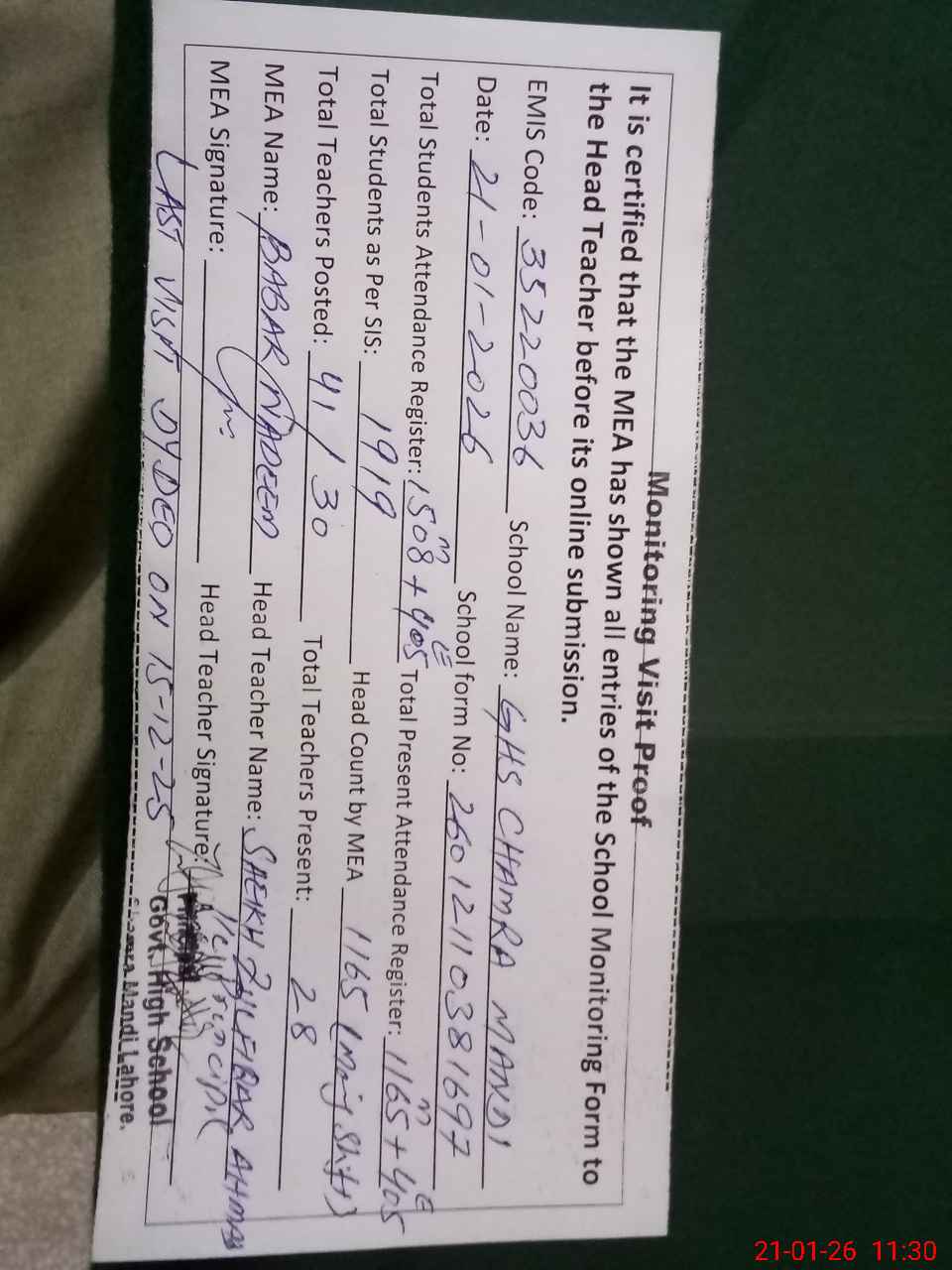 | Attendance Register | Head Teacher | MEA with School | Visit Proof |