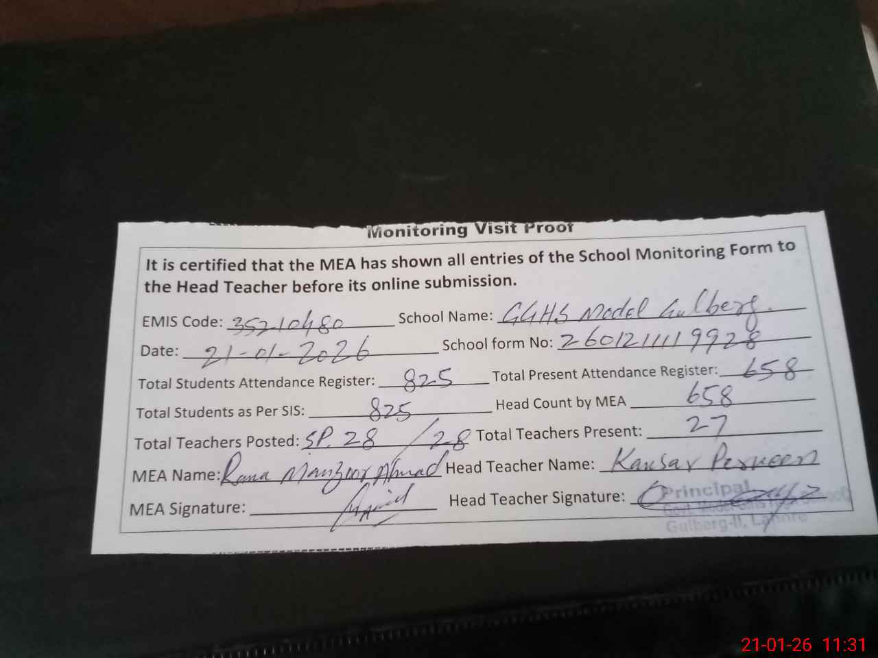 | Attendance Register | Head Teacher | MEA with School | Visit Proof |