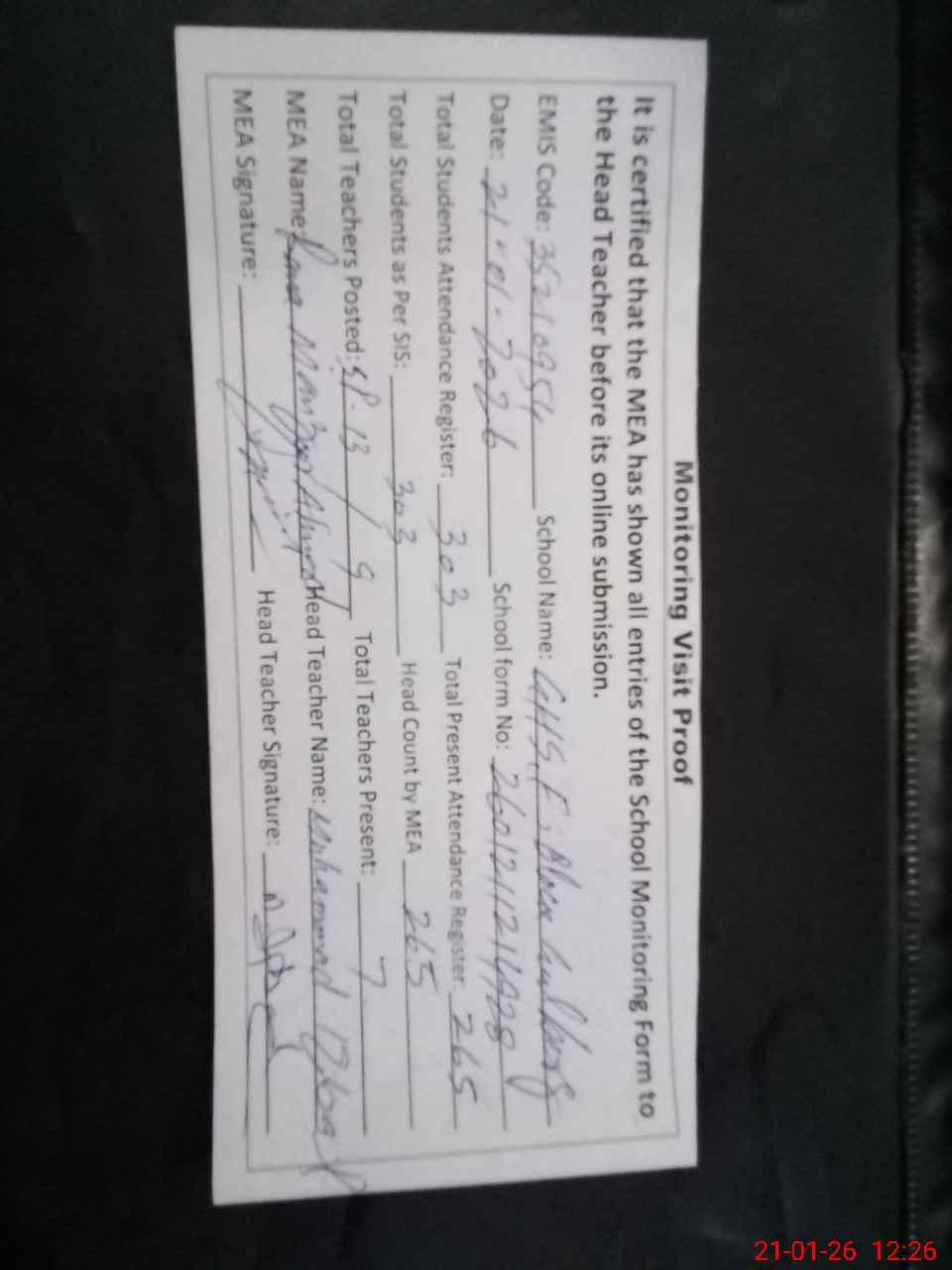 | Attendance Register | Head Teacher | MEA with School | Visit Proof |