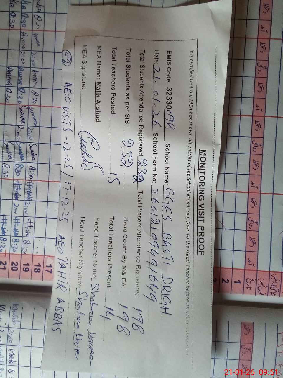 | Attendance Register | Head Teacher | MEA with School | Visit Proof |