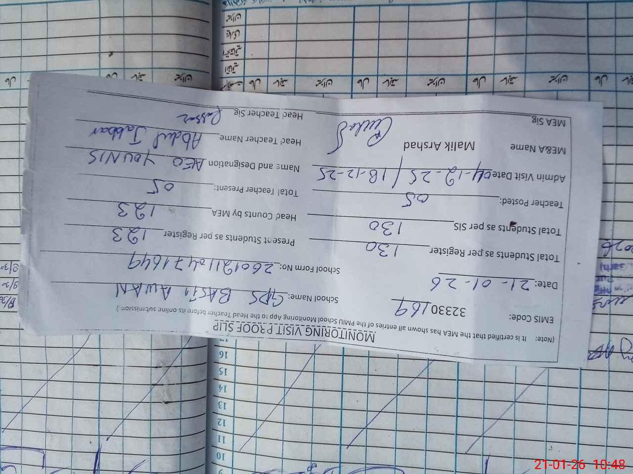 | Attendance Register | Head Teacher | MEA with School | Visit Proof |