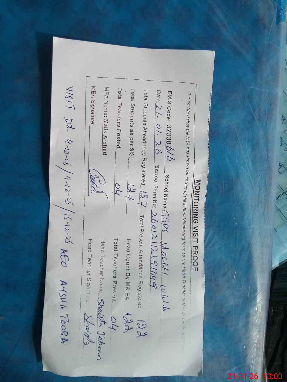 | Attendance Register | Head Teacher | MEA with School | Visit Proof |