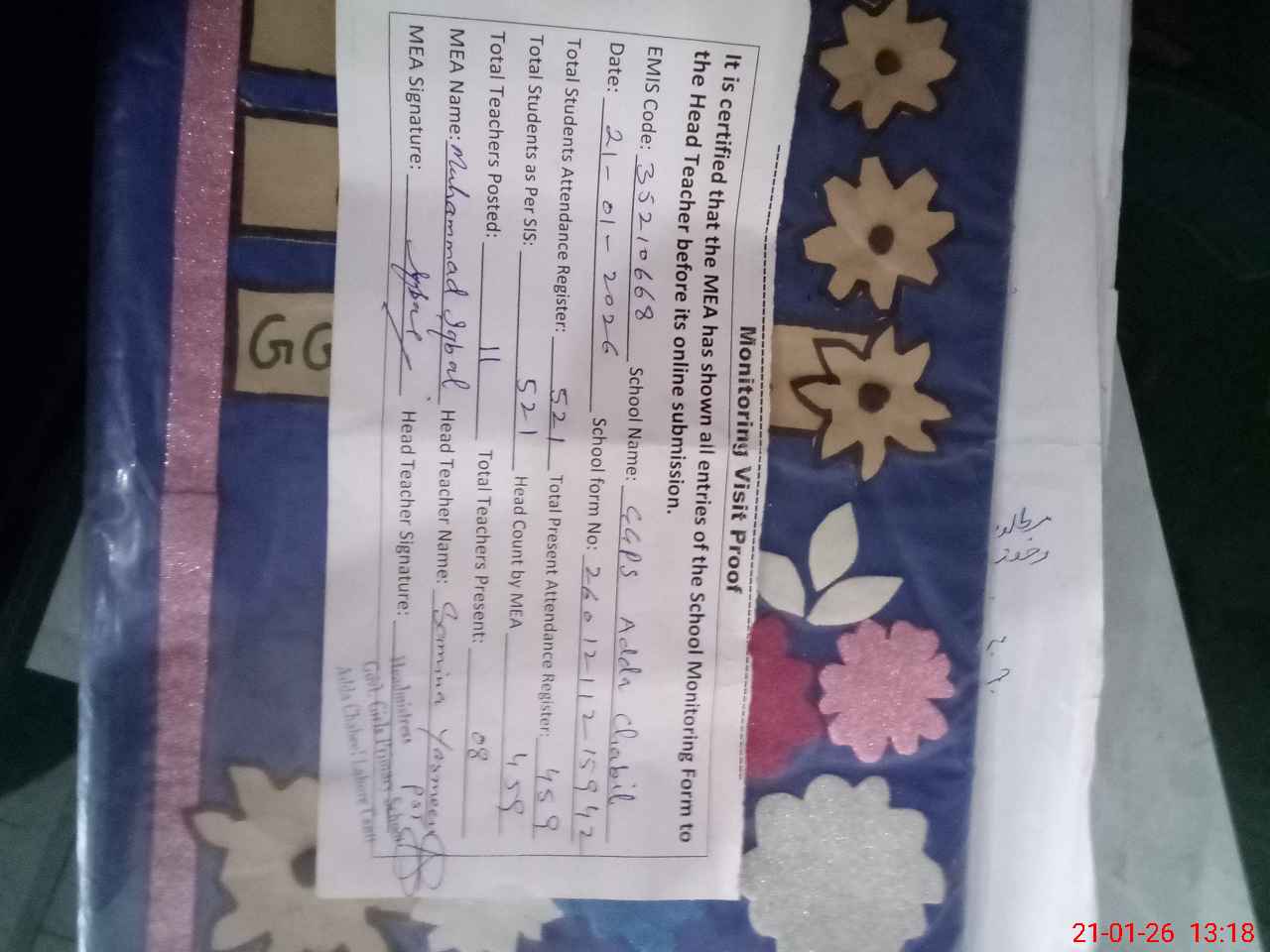 | Attendance Register | Head Teacher | MEA with School | Visit Proof |