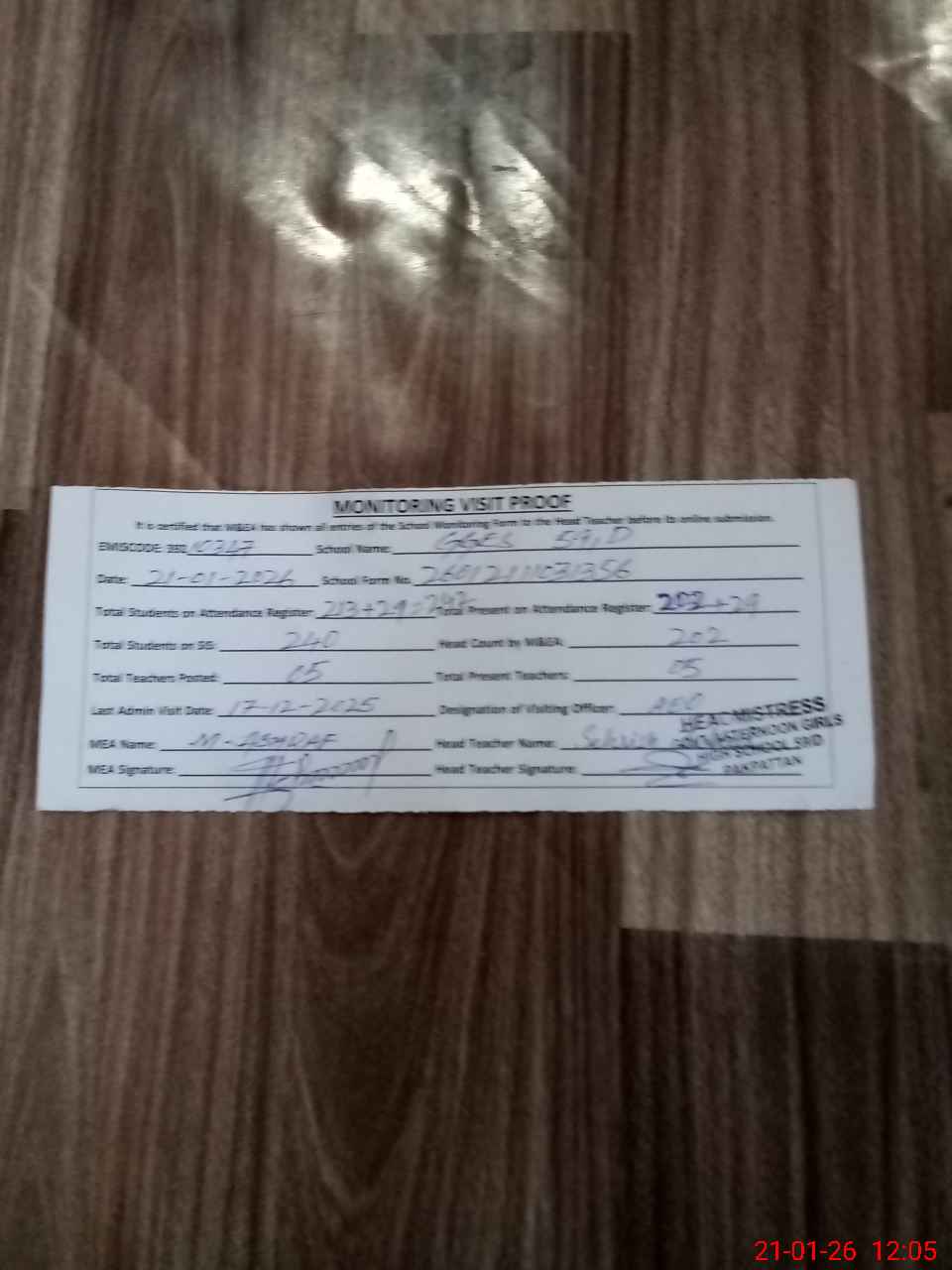 | Attendance Register | Head Teacher | MEA with School | Visit Proof |