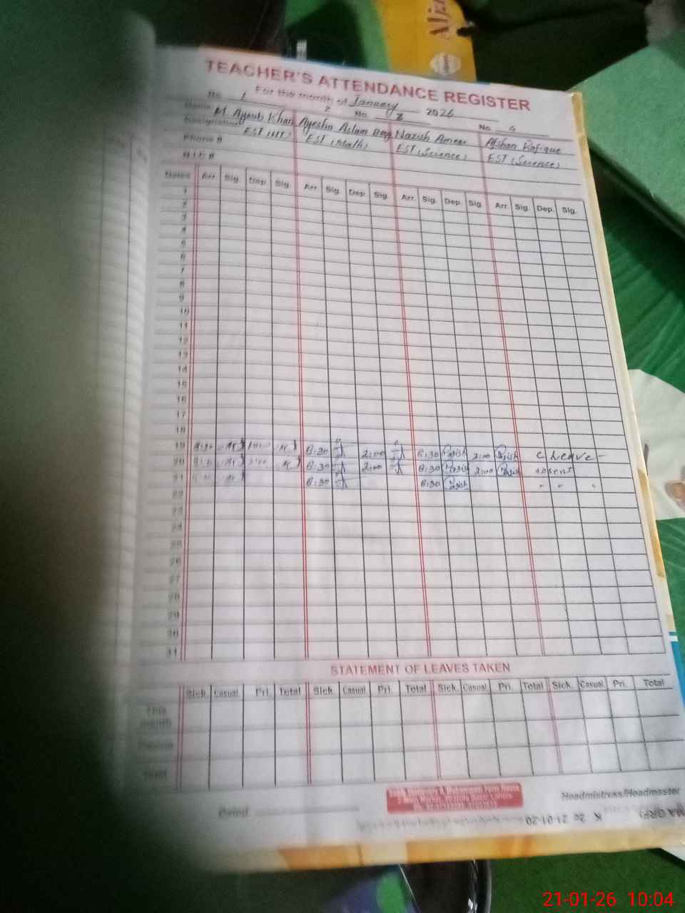 | 33**** | Af**** Ra**** | EST Science | Regular | 16 | 0 | 0 | 0 | 15 | 0 | 0 | 0 | 1 | Absent (Un-Authorized) |