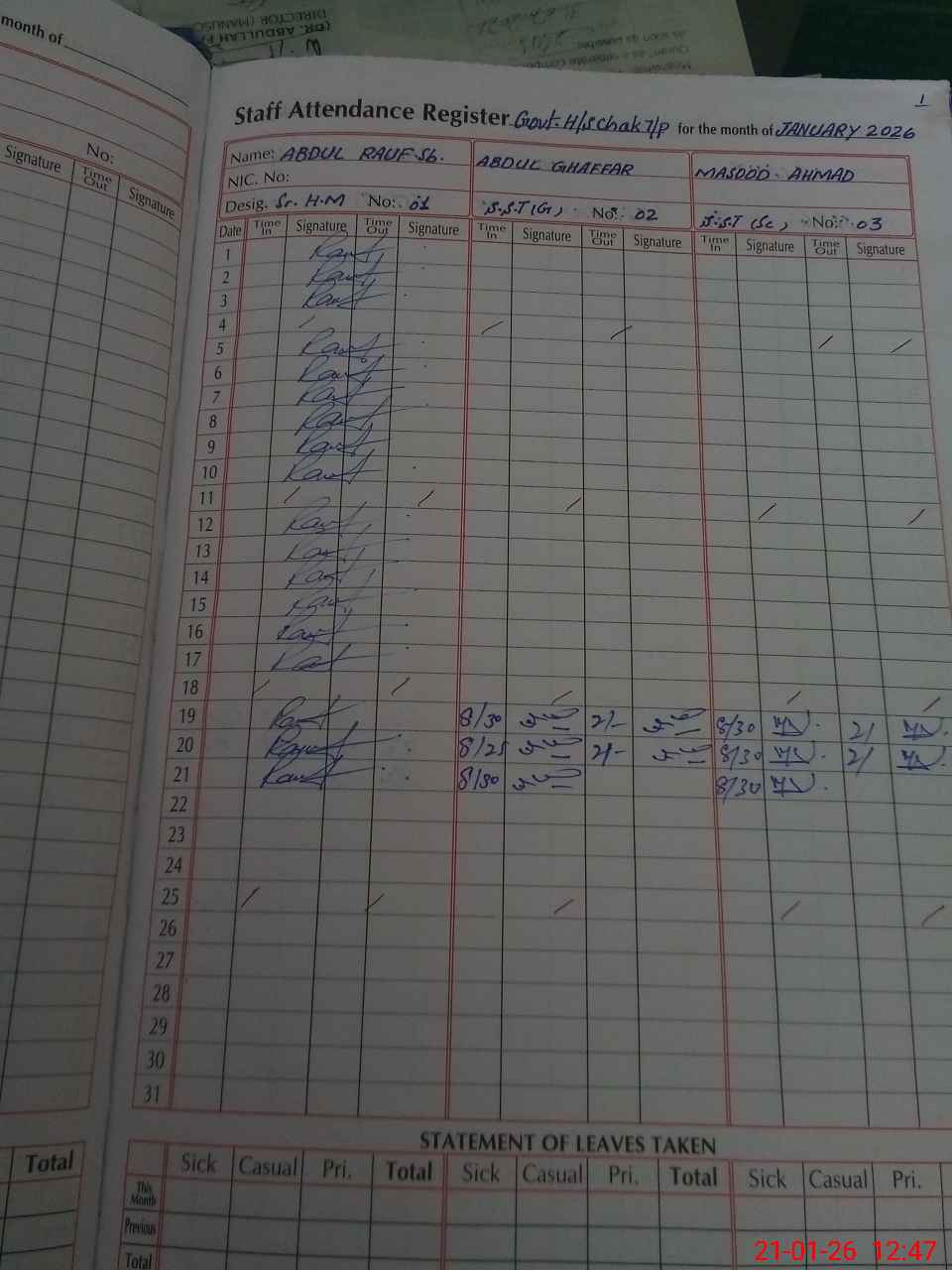 | CNIC | Full Name | Designation | R/C | Absence During Last Calender Month |