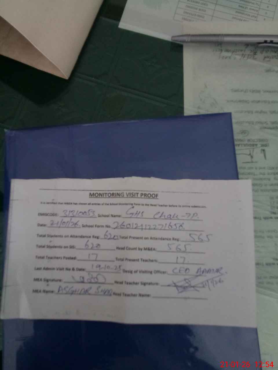 | Attendance Register | Head Teacher | MEA with School | Visit Proof |