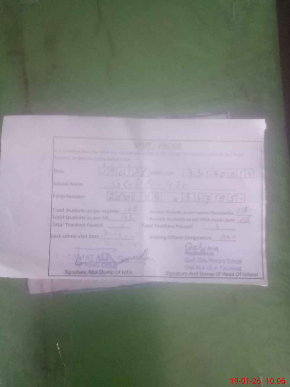 | Attendance Register | Head Teacher | MEA with School | Visit Proof |
