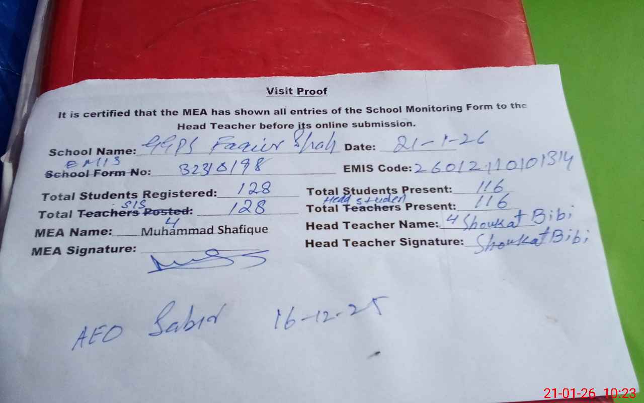 | Attendance Register | Head Teacher | MEA with School | Visit Proof |