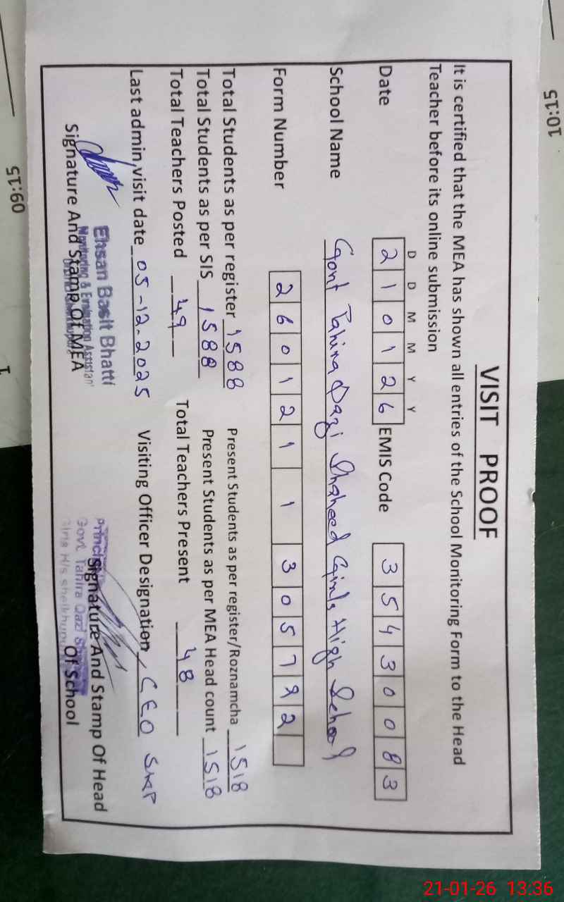 | EMIS Code: 35430083 | Name of School: GOVT. TAHIRA QAZI SHAHEED GIRLS HIGH SCHOOL SHEIKHUPURA | |||