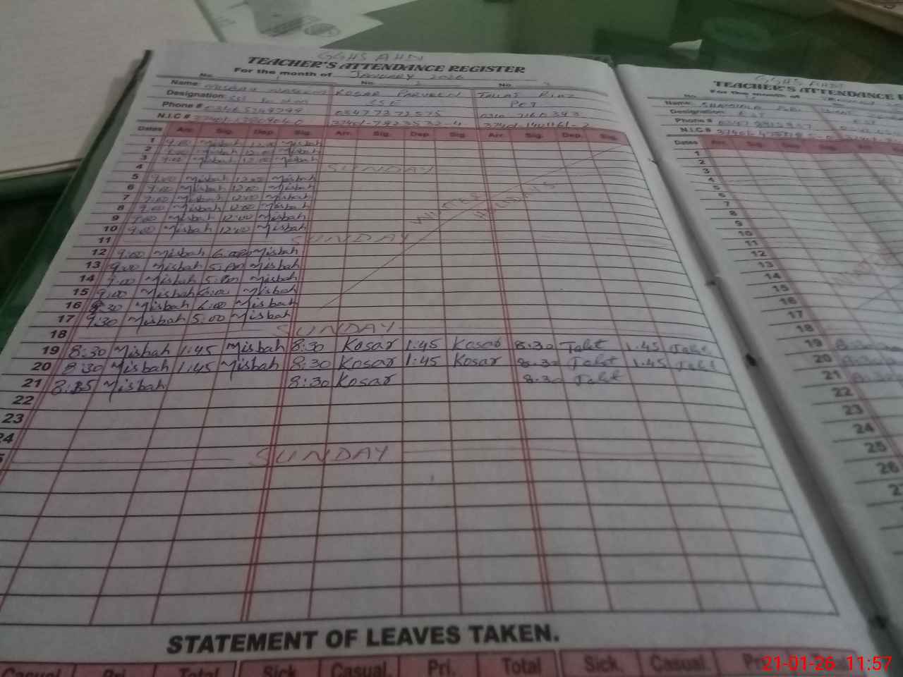 | CNIC | Full Name | Designation | R/C | Absence During Last Calender Month |