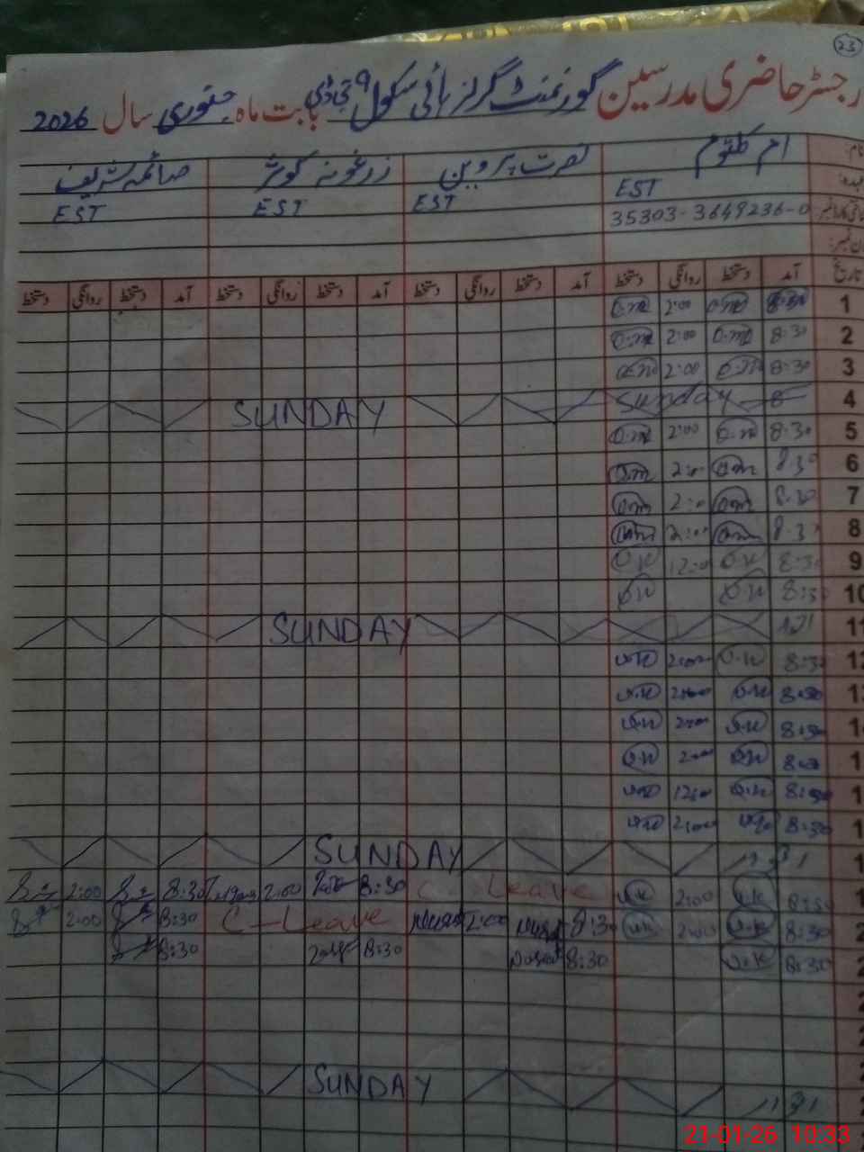 | Name: Um**** Ka**** Designation: (School Headmaster's/Headmistress's) EST Arebic Phone/Cell Number: 03**** |