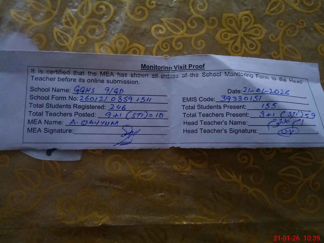 | EMIS Code: 39330151 | Name of School: GGHS CHAK NO.9/GD | |||