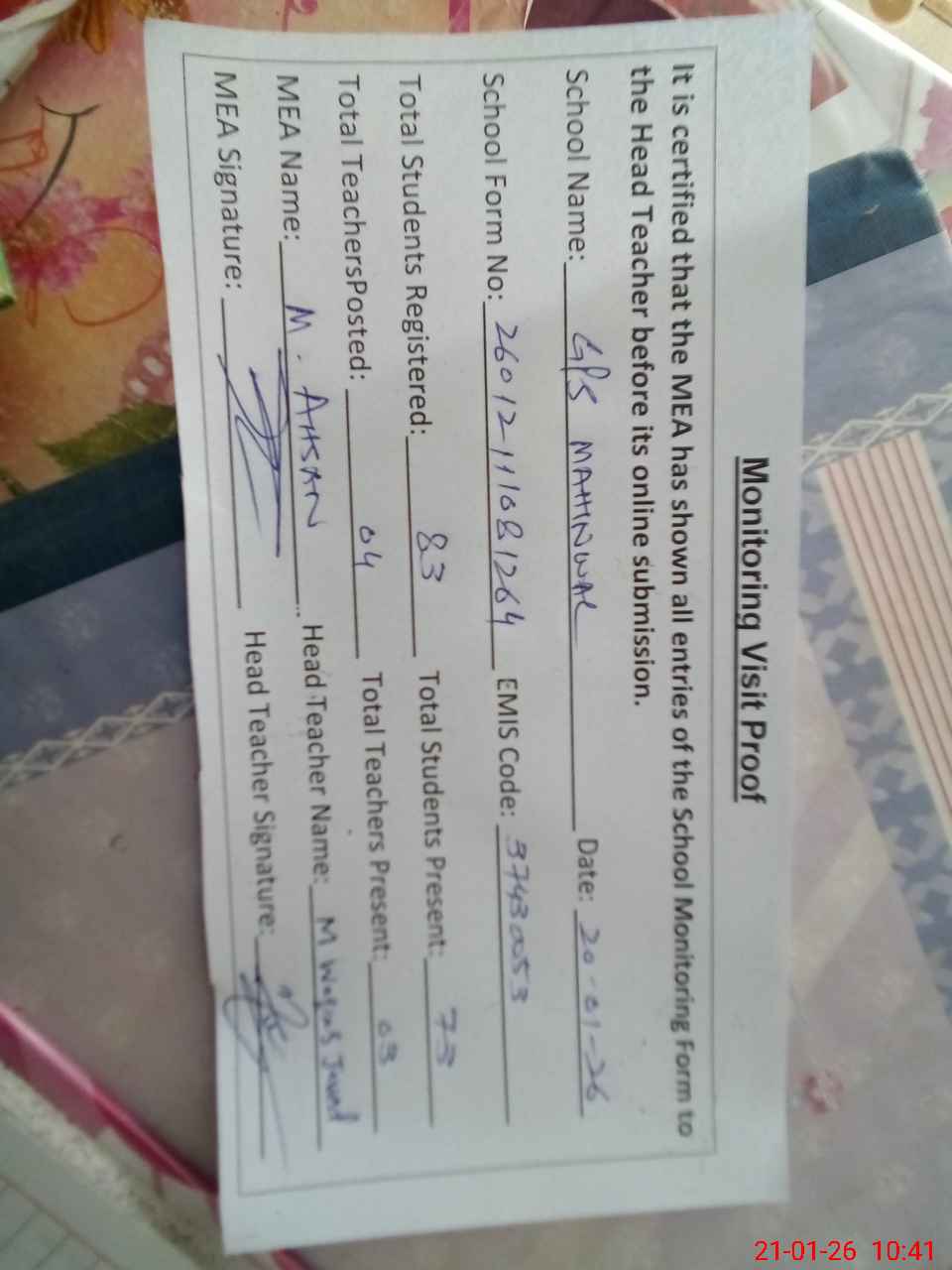 | Attendance Register | Head Teacher | MEA with School | Visit Proof |