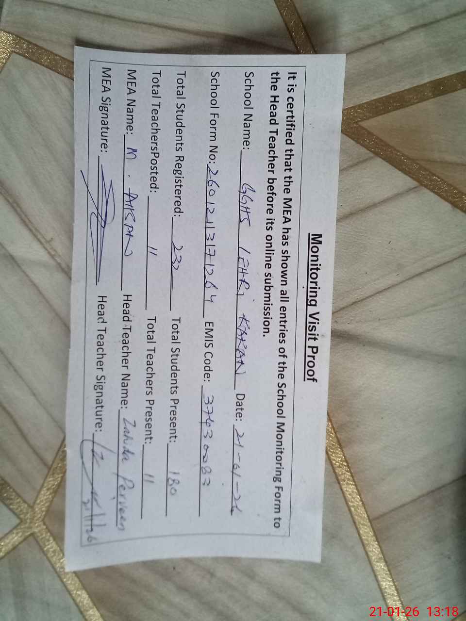 | Attendance Register | Head Teacher | MEA with School | Visit Proof |