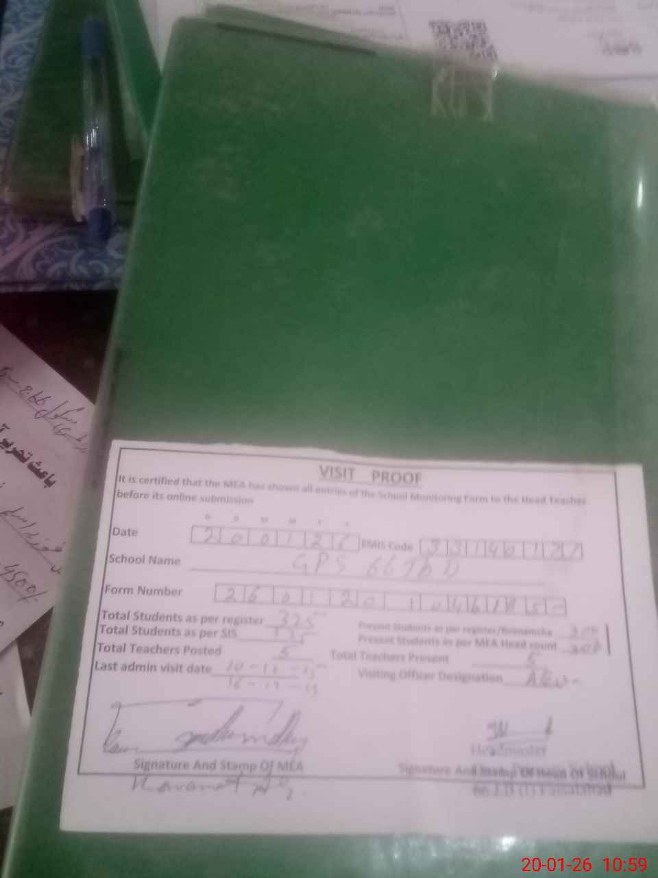 | Attendance Register | Head Teacher | MEA with School | Visit Proof |