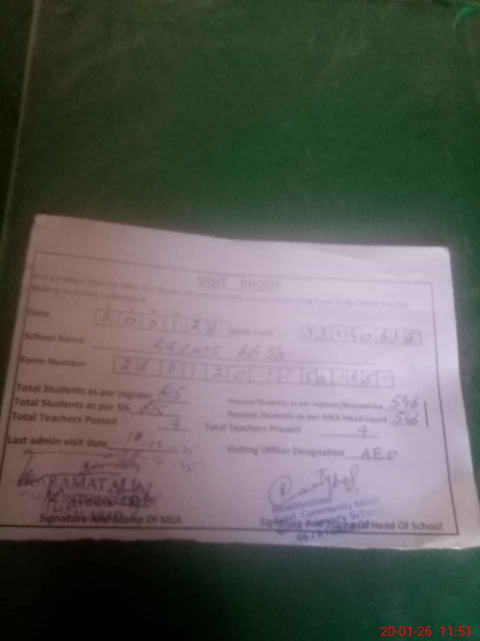 | Attendance Register | Head Teacher | MEA with School | Visit Proof |