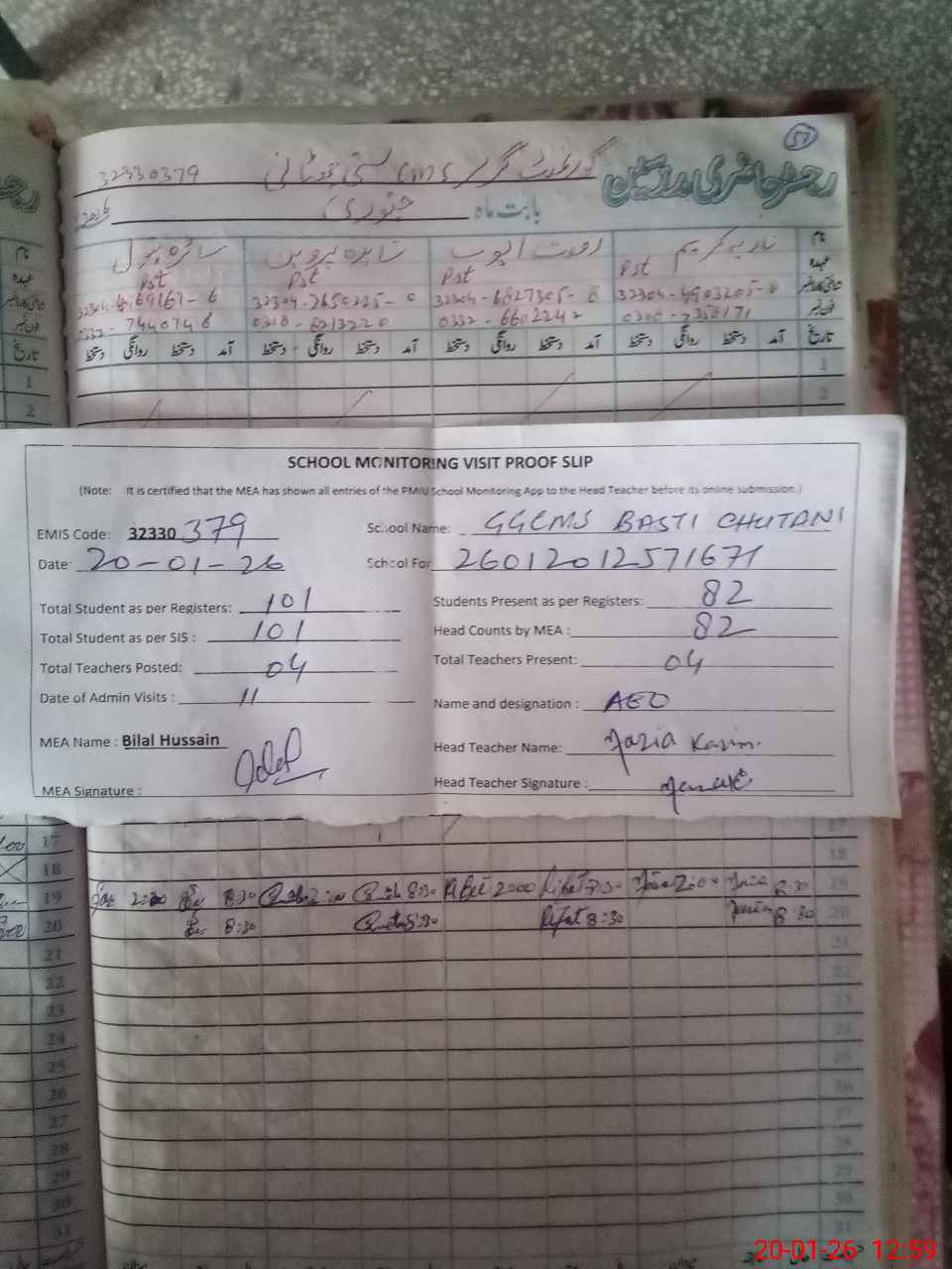 | Attendance Register | Head Teacher | MEA with School | Visit Proof |