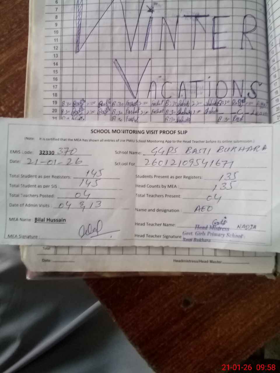 | Attendance Register | Head Teacher | MEA with School | Visit Proof |