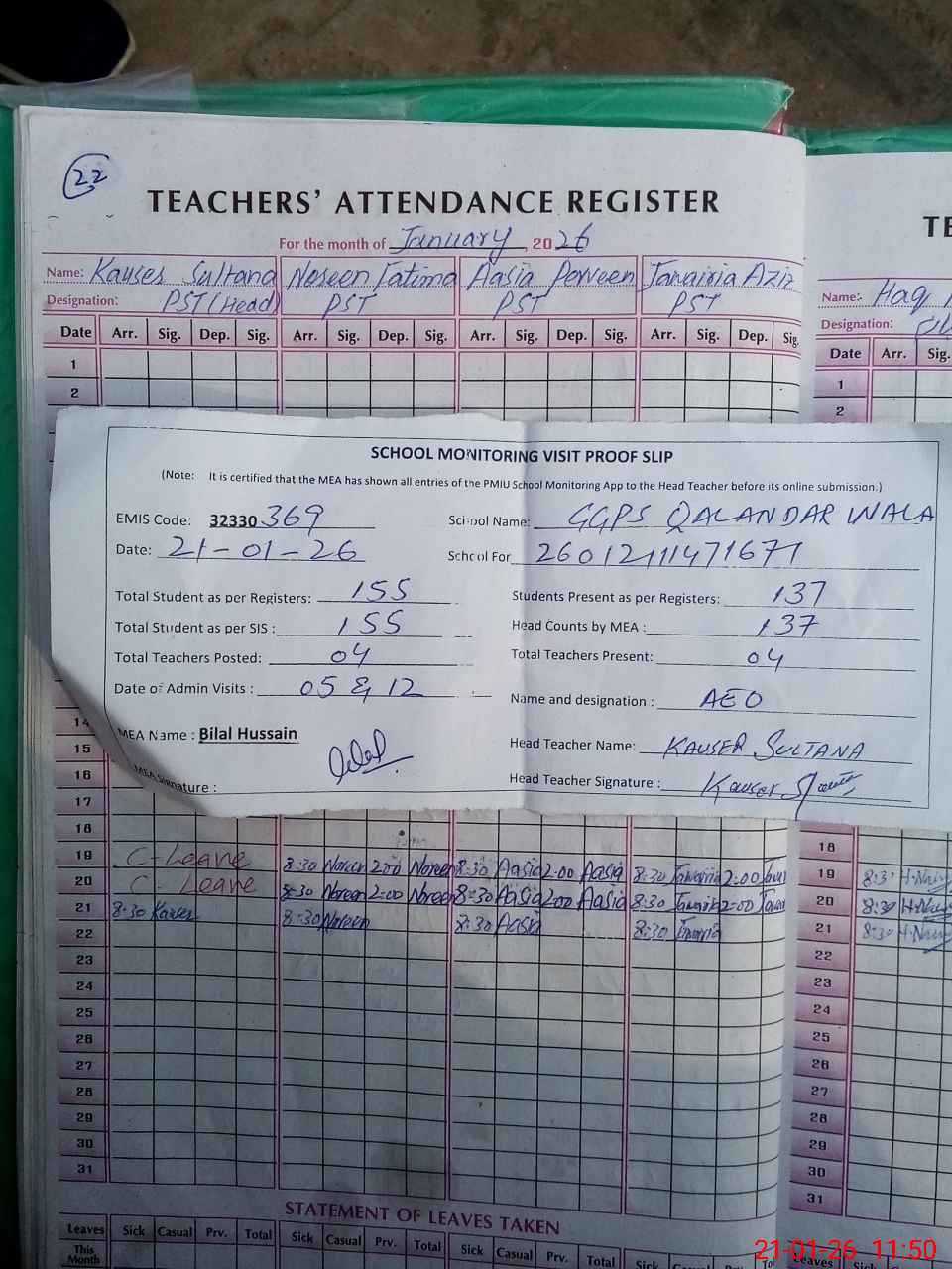 | Attendance Register | Head Teacher | MEA with School | Visit Proof |