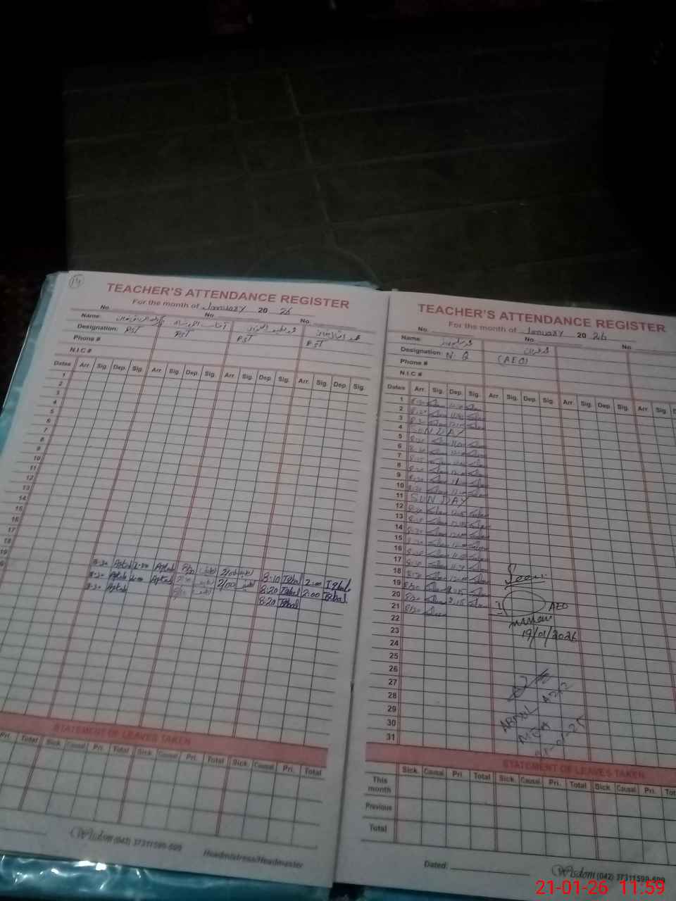 | CNIC | Full Name | Designation | R/C | Absence During Last Calender Month |