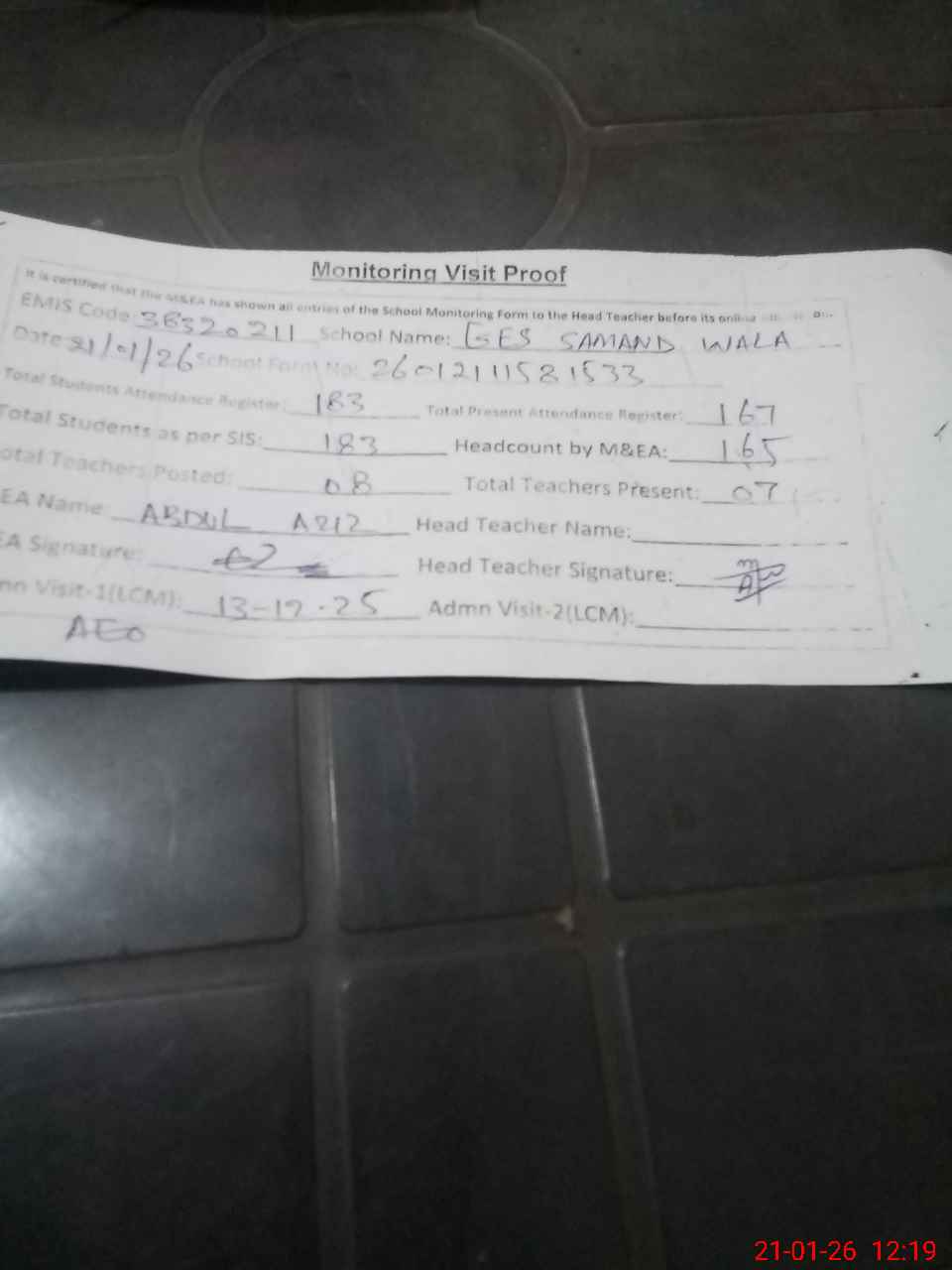 | Attendance Register | Head Teacher | MEA with School | Visit Proof |