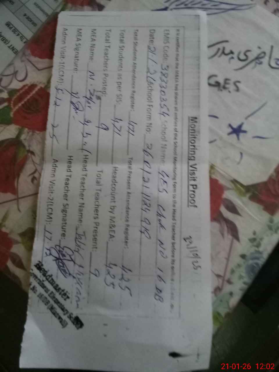 | Attendance Register | Head Teacher | MEA with School | Visit Proof |