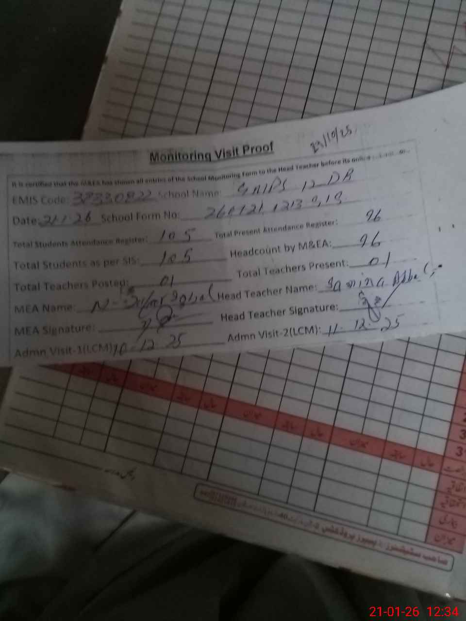 | Attendance Register | Head Teacher | MEA with School | Visit Proof |