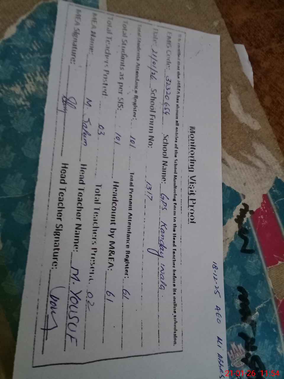 | Attendance Register | Head Teacher | MEA with School | Visit Proof |