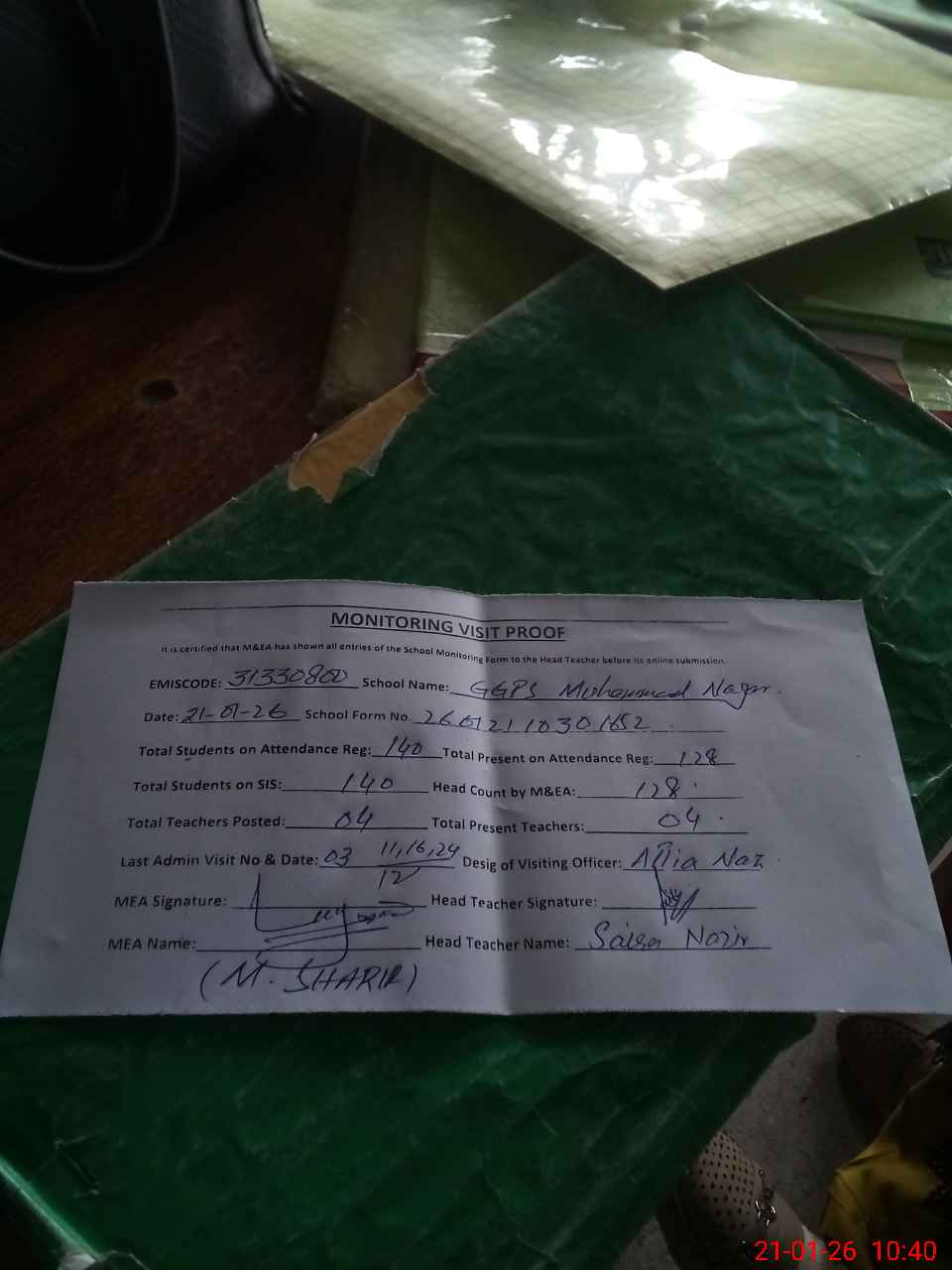 | Attendance Register | Head Teacher | MEA with School | Visit Proof |