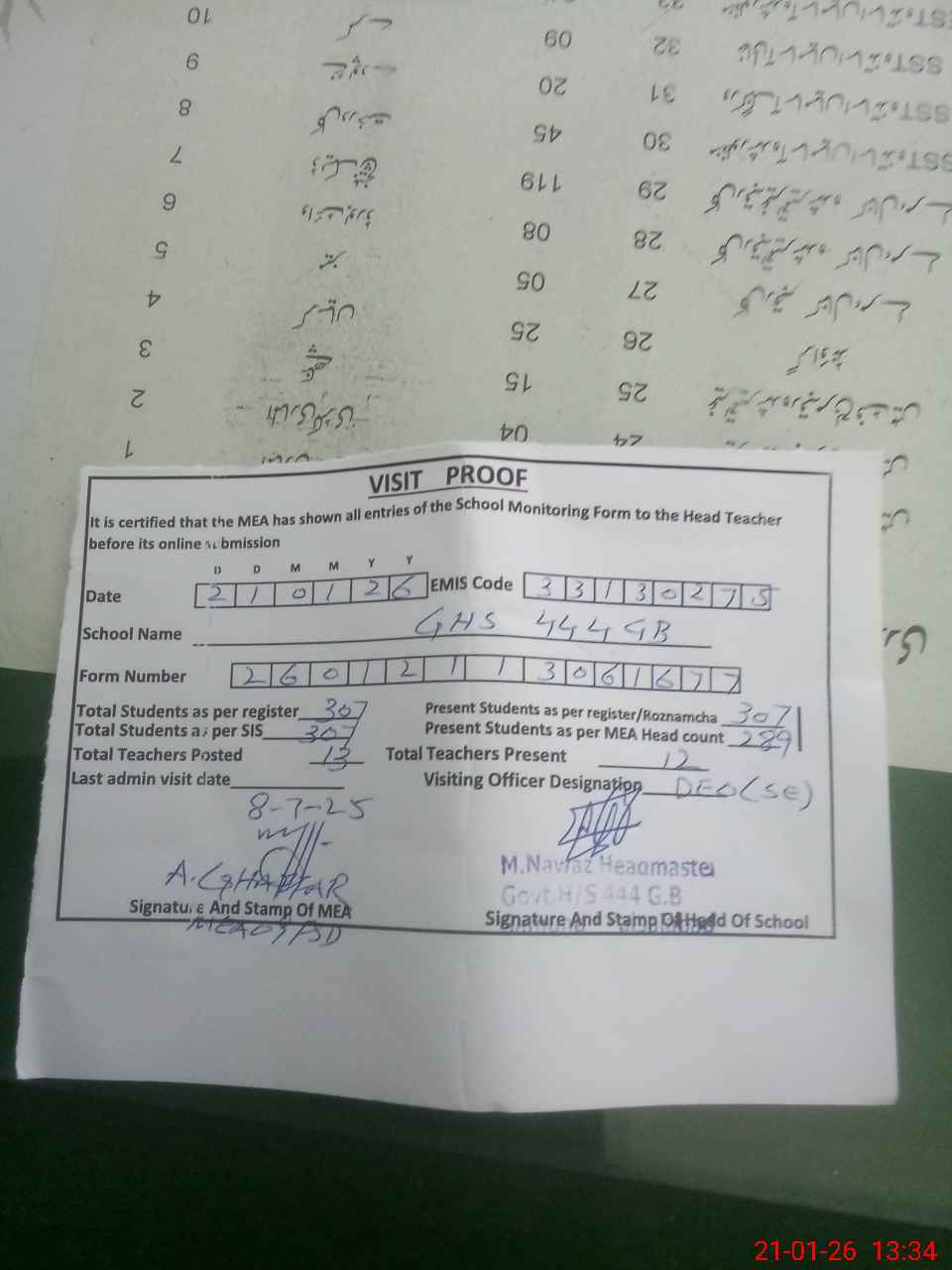 | Attendance Register | Head Teacher | MEA with School | Visit Proof |