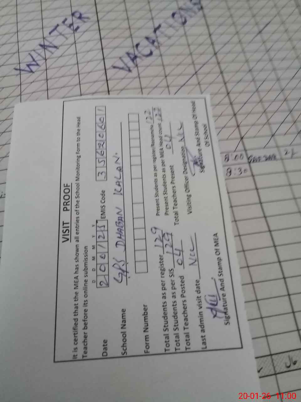 | Attendance Register | Head Teacher | MEA with School | Visit Proof |
