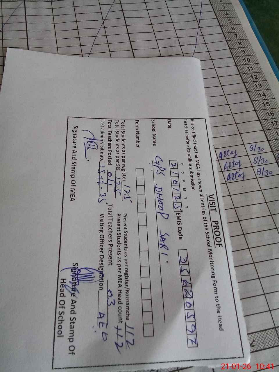 | Attendance Register | Head Teacher | MEA with School | Visit Proof |