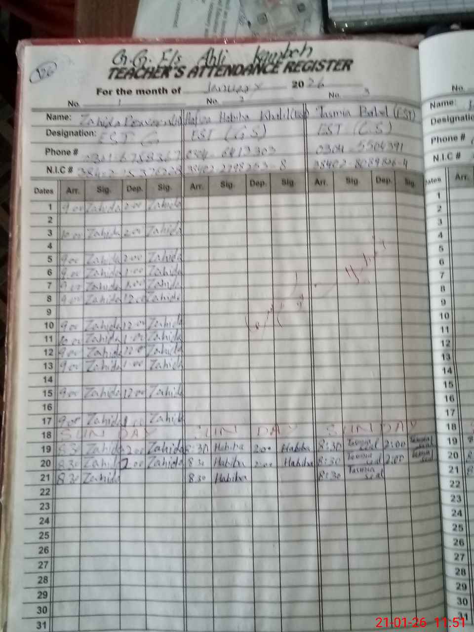 | CNIC | Full Name | Designation | R/C | Absence During Last Calender Month |