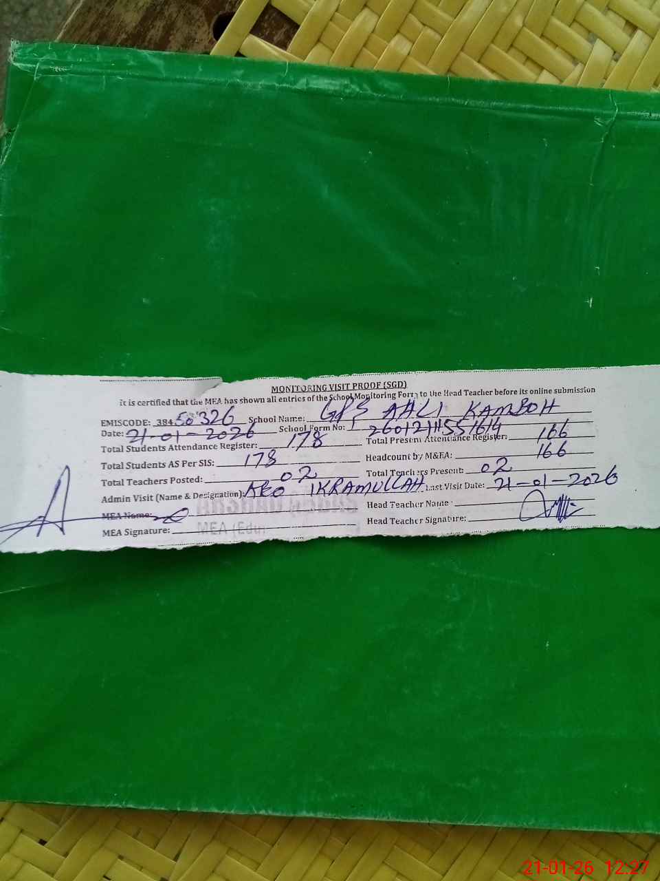 | Attendance Register | Head Teacher | MEA with School | Visit Proof |